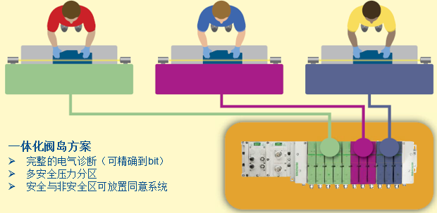 采用Zoned safety 总线阀岛的方案 采用Zoned safety 总线阀岛的方案对于最终用户而言(整车厂),提高了设备的安全等级降低了人员设备伤害和停机风险。为大批量连续不间断生产,提供了保障。