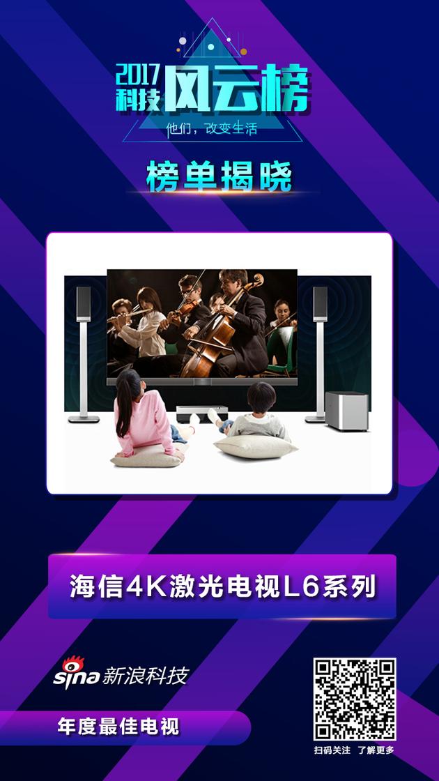 海信4K激光电视L6系列获科技风云榜年度最佳电视奖 新浪科技讯 1月22日下午消息,由新浪主办的“2017科技风云榜颁奖盛典”今日举行,盛典以“他们,改变生活”为主题,与众多行业领袖、业内打开共话科技时代。其中,海信4K激光电视L6系列获2017科技风云榜——年度最佳电视奖。 以下为科技风云榜颁奖词: 通过DLP超短焦4K镜头,海信给大尺寸电视带来新玩法。配合5.1音效环绕音响,完整的影音体验也可圈可点。