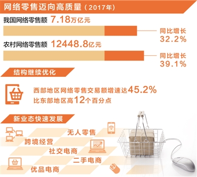 制图:沈亦伶 商务部25日举行的例行新闻发布会上,商务部新闻发言人高峰介绍了去年我国网络零售、农村电商、购物中心的发展情况和特点。 网络零售品质化趋势显现 高峰说,2017年我国网络零售由高速增长向高质量发展转变,零售额达到7.18万亿元人民币,呈现出以下几个特点: 一是市场规模不断扩大。2017年,全国网上零售额同比增长32.2%,增速较去年提高了6个百分点。其中,实物商品的网上零售额达到5.48万亿元,增长28%,占社会消费品零售总额的比重为15%,比上一年提升2.4个百分点。对社会消费品零售总额增长的贡献率为37.9%,比上年提升7.6个百分点。网络零售对消费的拉动作用进一步增强。 二是区域结构逐步优化。我国网络零售市场仍然保持着东强西弱的基本格局,中西部地区发展势头迅猛。根据商务部监测2017年网络零售交易额排名,前五的广东、浙江、北京、上海、江苏5个省市占全国比重为74.8%,较上一年下降了3.8个百分点,区域集中度有所下降。西部地区的交易额增速达到45.2%,比东部地区高出12个百分点。青海、西藏、甘肃等西部省份,2017年网店数量增速居全国前列。 三是业态多元化、消费品质化趋势显现。2017年,电子商务新主体、新业态快速发展,跨境经营、无人零售、社交电商、优品电商、二手电商等营造消费新场景,激发消费新需求,品质、智能、绿色商品已经被越来越多的消费者认可和选择。根据商务部监测,2017年智能穿戴、高端家电、生鲜食品、医药保健等商品品类网络销售增速均超过70%。 四是示范体系引领作用进一步增强。2017年,商务部积极推进电子商务示范体系建设,有关地方因地制宜,完善政策体系,打造高水平的公共服务。此外,遴选238家电子商务示范企业,引导规范经营、创新发展模式,形成了示范带头效应。比如,部分示范企业在个别地区农产品销售困难时,积极发挥行业的带头作用,有效缓解了销售困难问题。 五是农村电商促进精准扶贫取得了新成效。商务部持续推进电子商务进农村的综合示范,主要电商平台通过产业培育、物流建设、用工帮扶、金融支持等多种形式,助力脱贫攻坚。 六是“丝路电商”助推企业“走出去”。2017年,积极推动“丝路电商”国际合作,与“一带一路”7个国家建立双边电子商务合作机制,推动成立金砖国家电子商务工作组,达成《金砖国家电子商务合作倡议》,有力推动我国电子商务企业“走出去”,不断提高国际化的经营水平。 去年农村网络零售额同比增近四成 近年来,随着电商下乡,农村网络零售发展也越来越好。 据初步统计,2017年全国农村实现网络零售额12448.8亿元人民币,同比增长39.1%。截至2017年底,农村网店达到985.6万家,较2016年增加169.3万家,同比增长20.7%,带动就业人数超过2800万人。 农村实物类产品网络零售额7826.6亿元人民币,同比增长35.1%,占农村网络零售总额的62.9%。其中,服装鞋包、家装家饰、食品保健位居前三位,分别达到1600.3亿元、1129.5亿元、1031亿元人民币,同比分别增长30.5%、6.4%和61%。 农村服务类产品网络零售额达到4622.2亿元,同比增长46.6%,占农村网络零售总额的37.1%。其中,在线旅游、在线餐饮、生活服务居前三位,分别达到1831.9亿元、1625.8亿元、180.7亿元人民币,同比分别增长66.8%、58.6%、45.3%。在线旅游、在线餐饮表现尤为突出,对农村网络零售额增长贡献率分别达到了21%和17.2%,在农村网络零售全部19个品类中居于前两位。 从区域分布看,2017年东部、中部、西部、东北农村分别实现网络零售额7904.5亿元、2562.1亿元、1700.5亿元、281.8亿元,同比分别增长33.4%、46.2%、55.4%、60.9%。其中,东部农村网络零售额占比达到63.5%,优势依然明显。中西部及东北农村网络零售额合计为4544.4亿元人民币,同比增长50.4%,高出东部农村增速17个百分点。 从主要产品看,食品保健是对中部、西部和东北农村网络零售增长贡献最大的实物类产品,贡献率分别为11.5%、30.3%、29%。在线旅游是对中部、西部农村网络零售增长贡献最大的服务类产品,贡献率分别为30.8%、24.3%。在线餐饮是对东北、东部农村网络零售增长贡献最大的服务类产品,贡献率分别为14.2%、17.9%。服装鞋包是对东部农村网络零售增长贡献最大的实物类产品,贡献率为16.8%。 2017年,全国832个国家级贫困县实现网络零售额1207.9亿元人民币,同比增长52.1%,高出农村增速13个百分点。 购物中心市场保持积极向上态势 线上零售发展良好,线下的购物中心发展也保持向上态势。 商务部发布的2017年第四季度《中国购物中心发展指数报告》显示,2017年第四季度中国购物中心发展指数为67.2,环比第三季度上升0.3,高出荣枯线17.2,显示整体购物中心市场继续保持积极向上的态势。其中,现状指数为64.7,环比第三季度提升1.2,特别是租赁活跃度和运营表现指标明显向好;预期指数为70.9,高出现状指数6.2,市场对未来6个月的销售和租赁预期表现出乐观态势。 除成本控制指数外,2017年第四季度购物中心宏观市场指数、租赁活跃度指数、运营表现指数均高于荣枯线,表明业主对市场仍然有较强的信心;二线城市指数为69.8,环比第三季度上升5.0,一线城市指数环比小幅下滑,但租赁活跃度指数较高,反映出一线城市的项目仍受市场青睐;都市型和社区型物业指数分别为66.9、65.7,环比第三季度分别上升1.8和1.4,奥特莱斯型物业的租赁问询度和运营表现仍然优于其他类