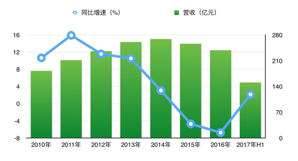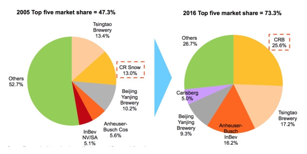 如图,自05年来啤酒行业集中度不断增加,到了2016年前五大品牌合计拥有73.3%的市占率,其中青岛为17.2%。 图中品牌按顺时针排序依次为:华润(红框所示)、青岛、百威英博、燕京、嘉士伯和其他。 从地域上来看,青岛主导山东市场(市占率70%)、陕西市场(80%),同时在上海市场占55%。 3 近年销售数据