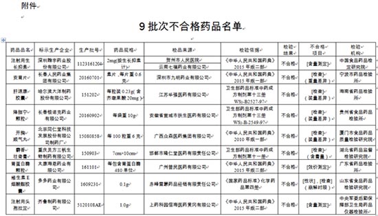 深圳翰宇药业股份有限公司生产的批号为1123161204的注射用生长抑素 长春人民药业集团有限公司生产的批号为20160701的安胃片 哈尔滨大洋制药股份有限公司生产的批号为151202的肝速康胶囊 长春银诺克药业有限公司生产的批号为20160902的降脂宁颗粒 北京同仁堂科技发展股份有限公司制药厂生产的批号为15080858的开胸顺气丸 重庆灵方三帆生物制药有限公司生产的批号为150903的麝香壮骨膏 太康海恩药业有限公司生产的批号为161101的胃蛋白酶颗粒 多多药业有限公司生产的批号为1609231的维生素E烟酸酯胶囊 齐鲁制药有限公司生产的批号为5120108AE的注射用头孢拉定