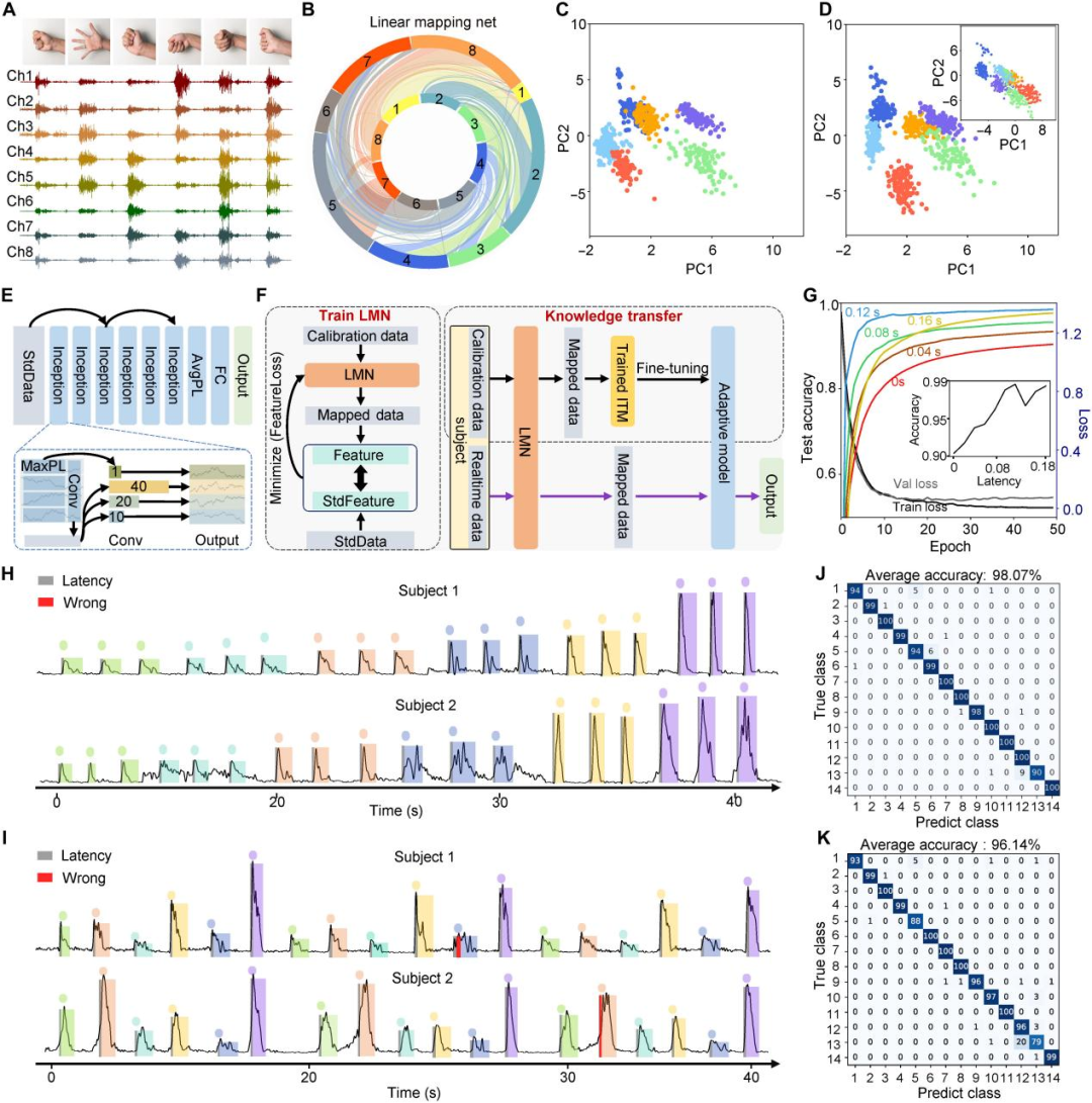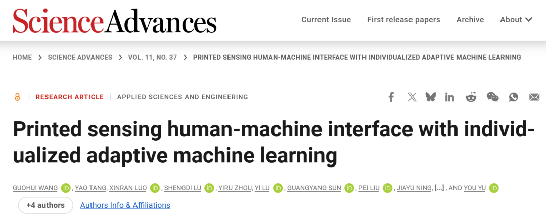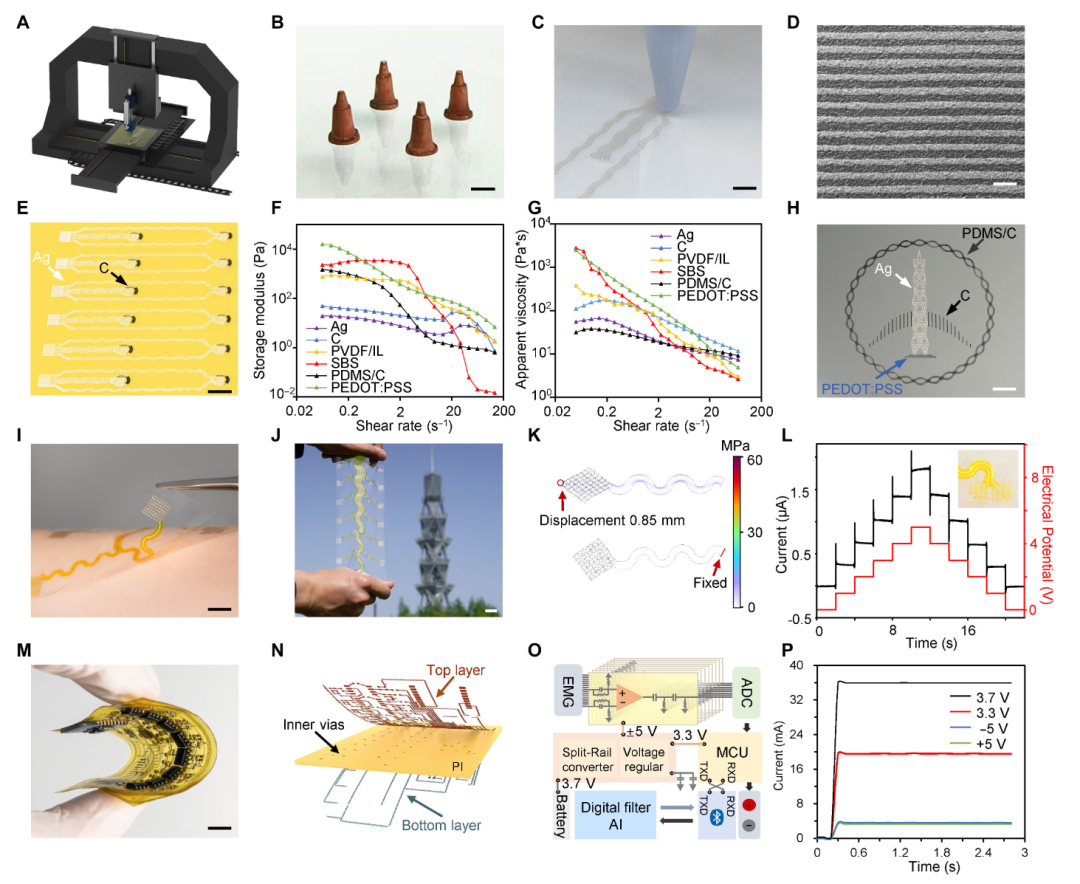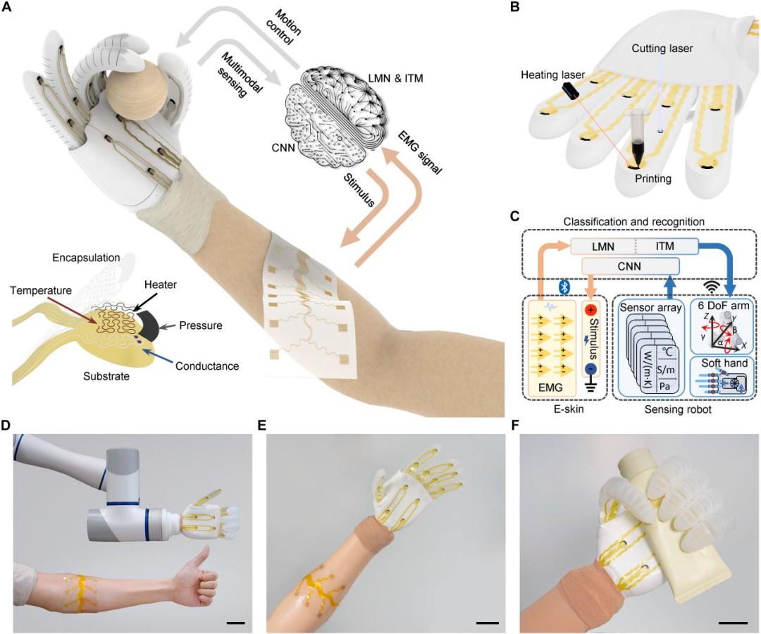 在我们日益数字化的世界中,人类与机器的交互方式正经历一场深刻的变革。从传统的键盘、鼠标,到触摸屏,再到语音控制与手势识别,人机界面不断朝着更直观、更自然的方向演进。近年来,一种被称为“软人机界面”的新兴技术,正在悄然重塑我们与计算机、机器人及智能设备之间的互动模式。 软人机界面,顾名思义是一种基于柔性电子技术的新型交互界面,它注重可用性、可访问性和可学习性,致力于让界面变得更加直观明了。其独特之处在于其能够实现双向通信,不仅人类可以控制机器,机器也能通过多种传感方式感知环境并向人类提供反馈,从而实现真正意义上的交互。 然而,尽管前景广阔,这项技术在实际应用中仍面临诸多挑战。例如,如何精准识别与解释复杂的生理信号?如何实现低成本、规模化制造?又该如何适配不同用户的个体差异?这些问题的解决,将直接影响软人机界面技术的普及与应用成效。 ▍柔性电子技术打造“电子皮肤” 针对以上难题,来自上海科技大学的研究团队提出了一种印刷人机界面。它由用于表面肌电图(sEMG) 采集和刺激反馈的电子皮肤、具有多模态触觉感知的传感软机器人以及用于手势分类和材料识别的机器学习算法组成。 该成果以“Printed sensing human-machine interface withindividualized adaptive machine learning”为题,发表在顶级期刊《Science Advances》上。 该技术的核心突破在于电子皮肤(e-skin)——一种超薄电子传感装置,可直接贴附于人体表面,实时监测多种生理信号。 研究团队采用了一种高效的集成印刷技术,包括直接墨水书写(DIW)、红外激光雕刻和激光切割,实现了多材料、高密度传感器阵列的大规模生产。他们使用了银油墨、碳油墨、聚二甲基硅氧烷/碳(PDMS/C)等多种功能性墨水,通过精密的三轴运动控制系统,可以在柔性基底上打印出宽度仅40微米的电路线。 软人机界面的打印和组装 这种电子皮肤展现出多项优异性能:首先,它具备高透明度和出色的机械柔韧性,可如第二层皮肤般贴合人体曲线,不影响自然活动;其次,采用蛇形电路结构设计,即使在拉伸变形时仍能保持均匀应力分布,确保电子元件性能稳定。更为重要的是,该电子皮肤不仅能采集表面肌电信号,还可通过施加不同特征电压实现多种表皮刺激效果,完成人机之间的双向通信。 为配合电子皮肤的数据采集,研究人员还开发出具有无线传输功能的双层柔性电路。该电路由两层印刷银电路及中间聚酰亚胺层构成,通过银墨水过孔实现层间互联,并以PDMS进行封装,保障了系统长期运行的可靠性。 ▍智能算法:让机器学会理解人类意图 然而,仅仅有高性能的硬件还不足以实现自然的人机交互。最大的挑战在于,如何让机器准确理解人类的意图? 表面肌电信号(sEMG)是肌肉活动时产生的电信号,包含了丰富的运动意图信息。但这些信号存在很大的个体差异性和不稳定性——同一个手势,不同人做出的肌肉活动模式可能不同;甚至同一个人在不同时间做出的相同手势,由于电极位置微小变化或肌肉状态改变,也会导致信号特征发生变化。 面对这一挑战,研究团队提出了一种创新的解决方案:结合线性映射网络(LMN)和起始时间模型(ITM)的自适应机器学习方法。 LMN负责调整不同通道信号的权重,使得来自不同用户的信号能够适应统一的标准分布。ITM则是一种轻量化的卷积神经网络(CNN),擅长捕捉时间序列中的局部特征,具有低延迟和高精度的特点。 用于sEMG 数据分析的个体自适应机器学习模型 这种方法最引人注目的优势是它的学习能力。一个新使用者只需要执行三次重复的手势,系统就能通过迁移学习策略调整模型参数,实现个性化适配。这种“即学即用”的特性极大地提高了系统的实用性和用户体验。 在实际测试中,该系统在0.1秒的延迟内就能达到98.33%的分类准确率,这对于实时交互应用至关重要。即使将手势类别从6个扩展到14个,系统仍能保持高精度识别。 ▍多模态感知:机器人的"感官系统" 软人机界面的另一个重要特点是为机器人装上了“感官系统”。通过在多模态传感器阵列中集成温度、压力、热导率和电导率传感,机器人首次能够像人类一样通过触摸来识别物体特性。