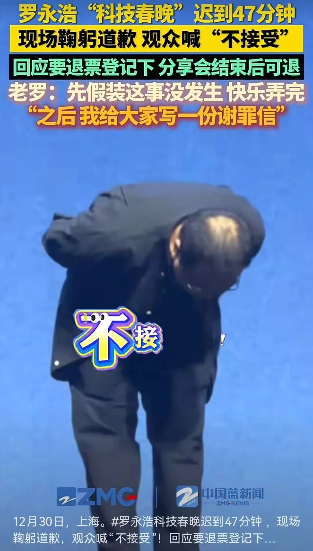 来源:“罗永浩的十字路口”极目新闻记者注意到,本场分享会原定于12月30日晚7时开始,因故直到当晚7时40分许才开场。罗永浩在后台回应称,将在会后就开场延误一事进行解释。随后,罗永浩在现场鞠躬道歉。来源:“罗 ...