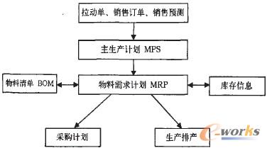 业务流程如图1所示。计划员根据拉动单和其他销售订单的情况,并参考以往各周的情况,以拉动单、销售订单和销售预测作为主生产计划(MPS)的输人,编制主生产计划,主生产计划以周为单位。然后根据编制完成后的MPS作为物料需求计划(MRP)分解计算的数据源头,进行物料需求计划的解算,同时根据能力负荷报告情况调整MPS,并最终得到各个层次物料的采购和制造计划。分别提交给生产配套部采购人员和生产调度人员。在MRP系统运算处理前,技术部应提供相关产品的物料清单(BOM)以及相关产品的工艺路线文件和工作中心文件信息,库存部门应提供库存信息。物料需求计划生成后,即可按需求产生采购计划,并进行生产排产。