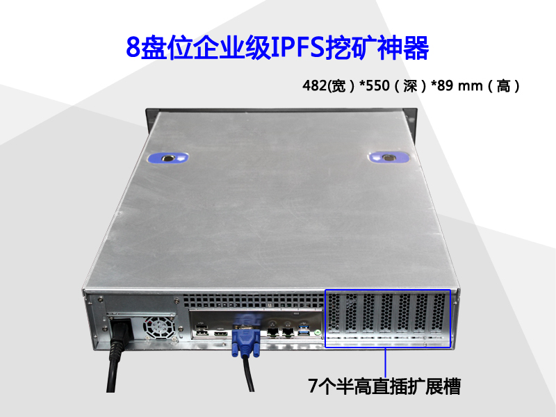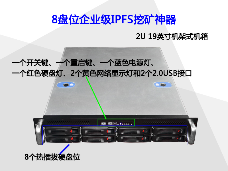 R255-8这款机箱采用1.2MM后的镀锌钢板制作而成,表面不加LOGO,强度加强,耐指纹,抗氧化,在稳定性方面绝对有保障。外箱尺寸为482(宽)*550(深)*89 mm(高),是标准的2U 19英寸机架式企业级IPFS挖矿机箱。前面板设置8个热插拔硬盘抽取盒,方便用户对硬盘的检测和维护。