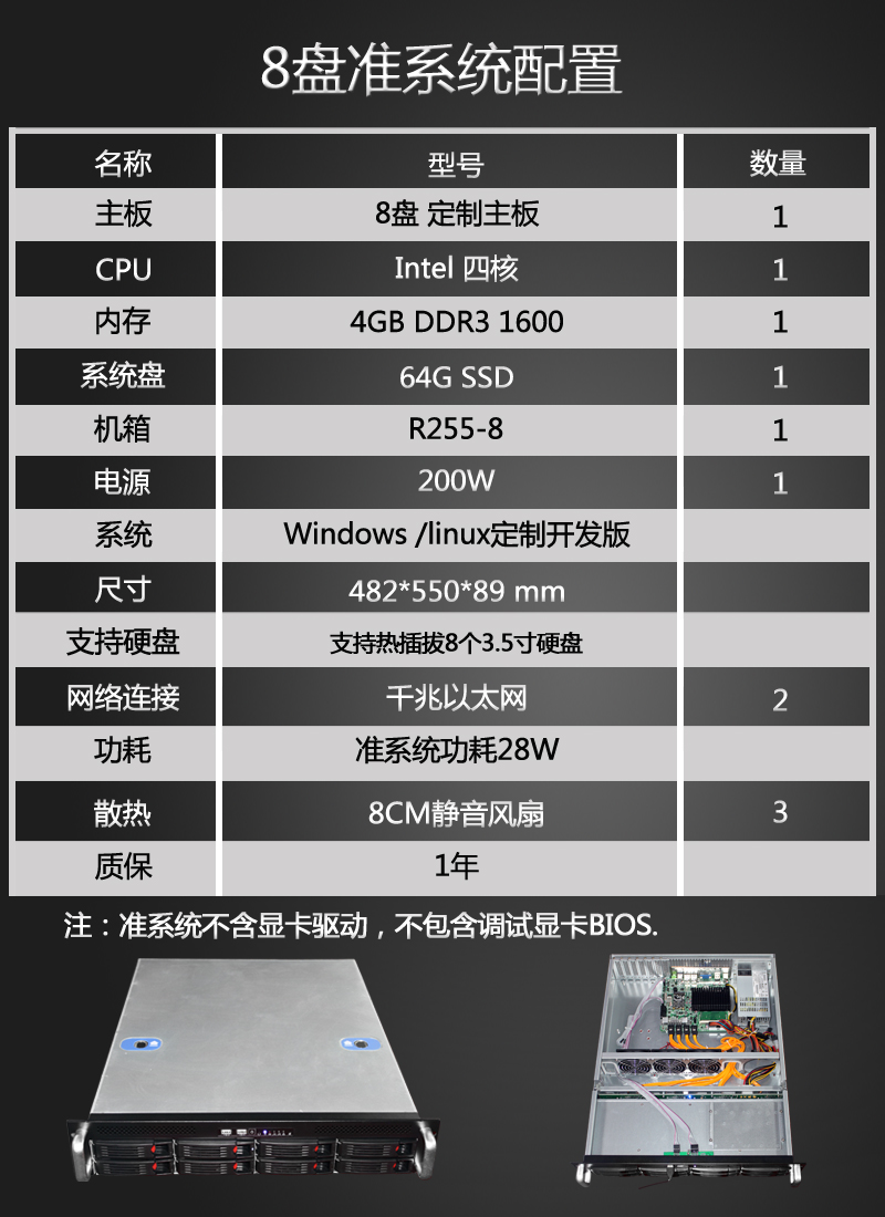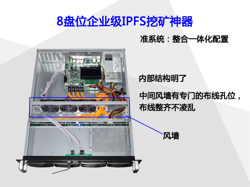 这款机箱迈肯思有推出不含显卡的准系统一体式配置方案,可兼容主板的最大尺寸为12"* 9.6"(305*245MM),也支持定制的8盘位的定制主板。电源可配置1U 300W的FLEX电源,再装上CPU、内存和系统盘,装是Linux系统,接上网线,连接好显示屏,这样一个可以挖矿的硬件平台就搭建好了。