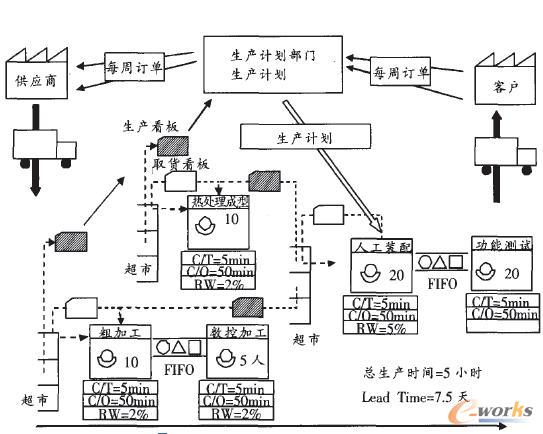 由现状图与未来价值图对比可见,未来价值流图3中各个功能块之间已经不再用缓冲库存来连接。产品的增值加工时间仍为5小时,但产品的制造周期大大减少,降低到7.5天。未来价值流图为制定实现精益生产方式的计划提供了基础。但是真正实施还需要周密的计划和大量的工作。价值流图方法本身并没有提供结构化的方法,而仅仅提供了一些经验性的指导原则,因此,价值流图方法的应用,还必须借助有相当经验的管理人员来进行。